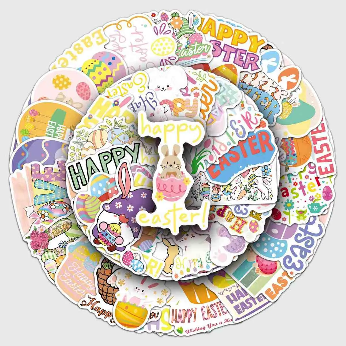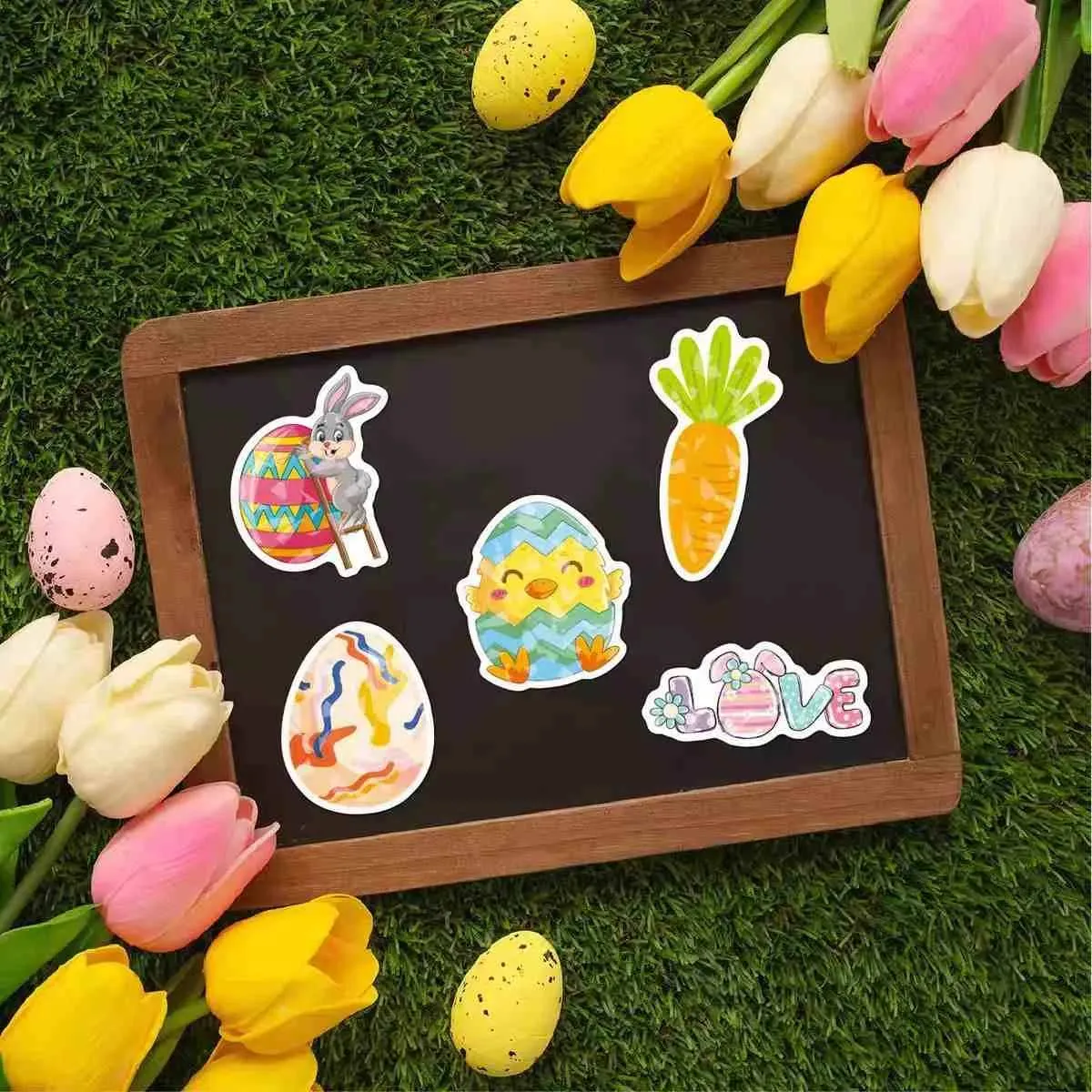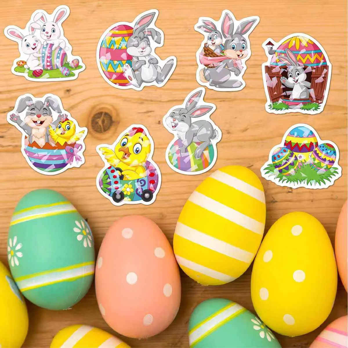 Lämplig för olika påskbruk: små klistermärken för ägg eller chokladskal, medium för presentförpackningar och korgar, och stora för fönsterutställningar. Avlägsnar enkelt utan rester från ytor som glas, plast eller trä.