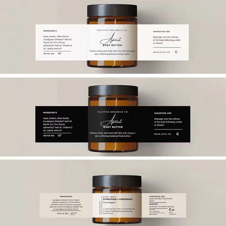 Face Cream -etiketten är en etikett som är speciellt designad för ansiktskräm och är en oumbärlig del av den. Etiketten på ansiktskräm är ett effektivt sätt för konsumenter att lära sig om produktrelaterad information (som produktingredienser, användningsmetoder, produktionsdatum och hållbarhet etc.), och det är också ett sätt för varumärken att förbättra deras produktimage och stärka varumärkesigenkänning. Etiketterna på ansiktskräm som produceras av Jojo Pack har inte bara information relaterad till ansiktskräm, utan är också gjorda av högkvalitativa material för att säkerställa hållbarhet i olika miljöer.