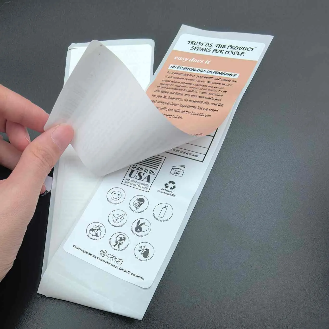 Skala och läs etiketterna:Den mest grundläggande typen, Det kallas även multiLayer för kosmetiska etiketter. Det övre lagret är lätt att dra av, och det inre lagret innehåller utökad information. Det används ofta för ansiktsmasker, serum och andra småförpackade produkter.
