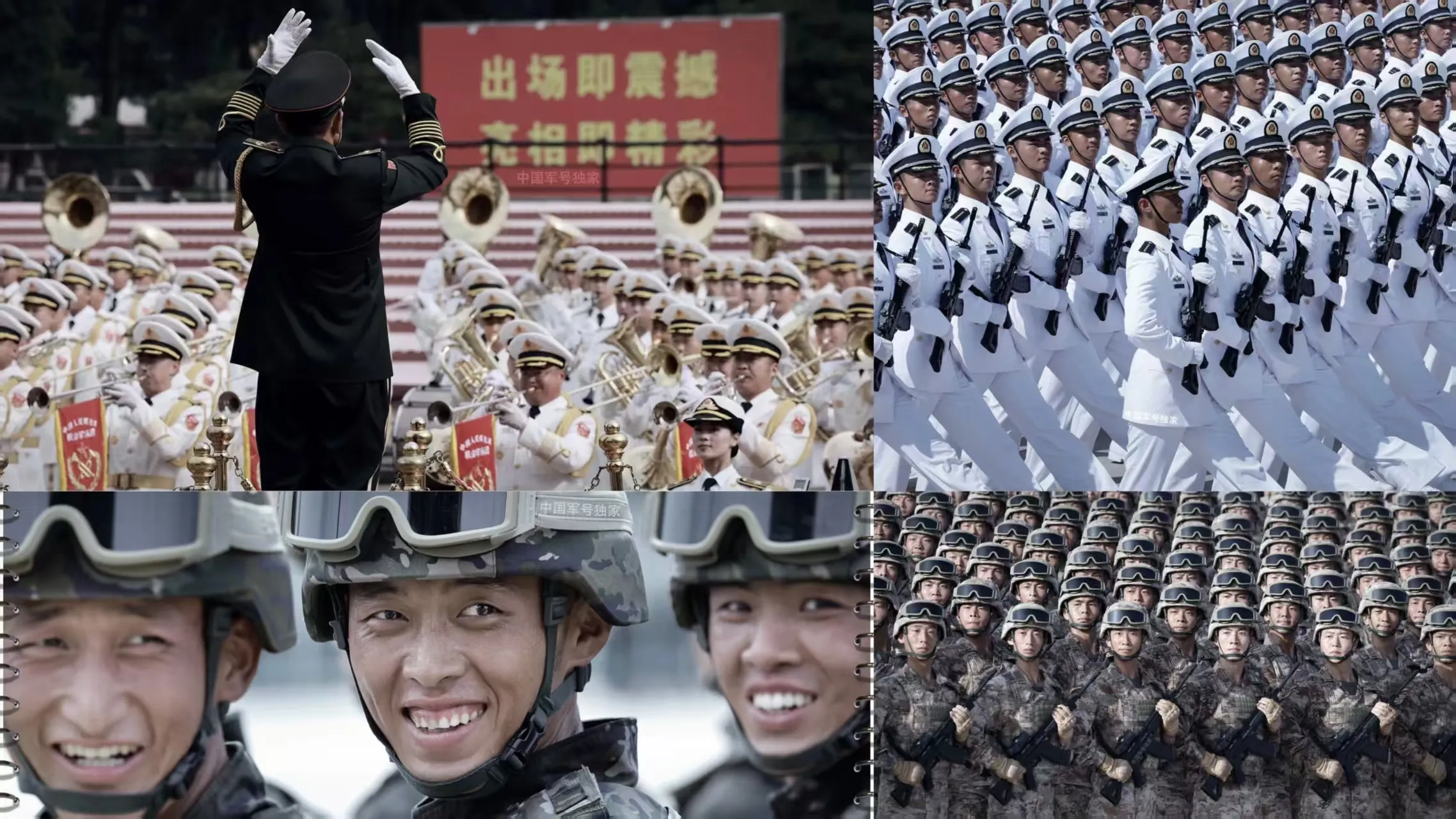 På Tiananmen Square passerade 45 formationer och echelons i följd, och ett gemensamt militärband bestående av mer än tusen officerare och soldater spelade de kraftfulla ljuden från eran.