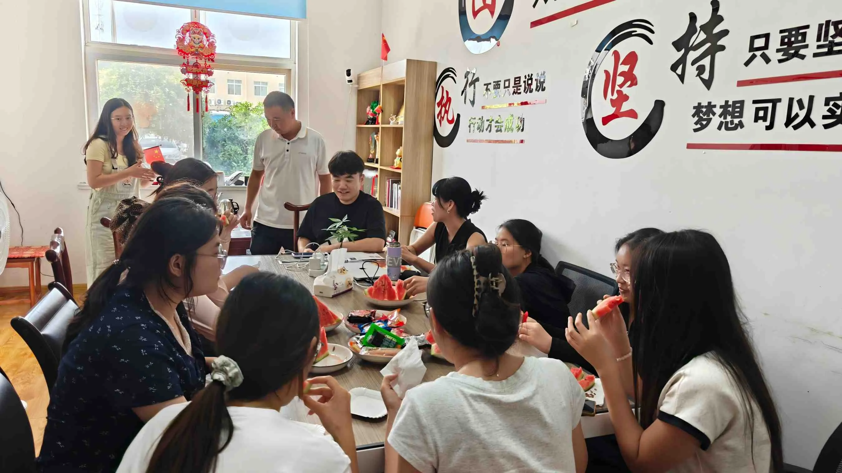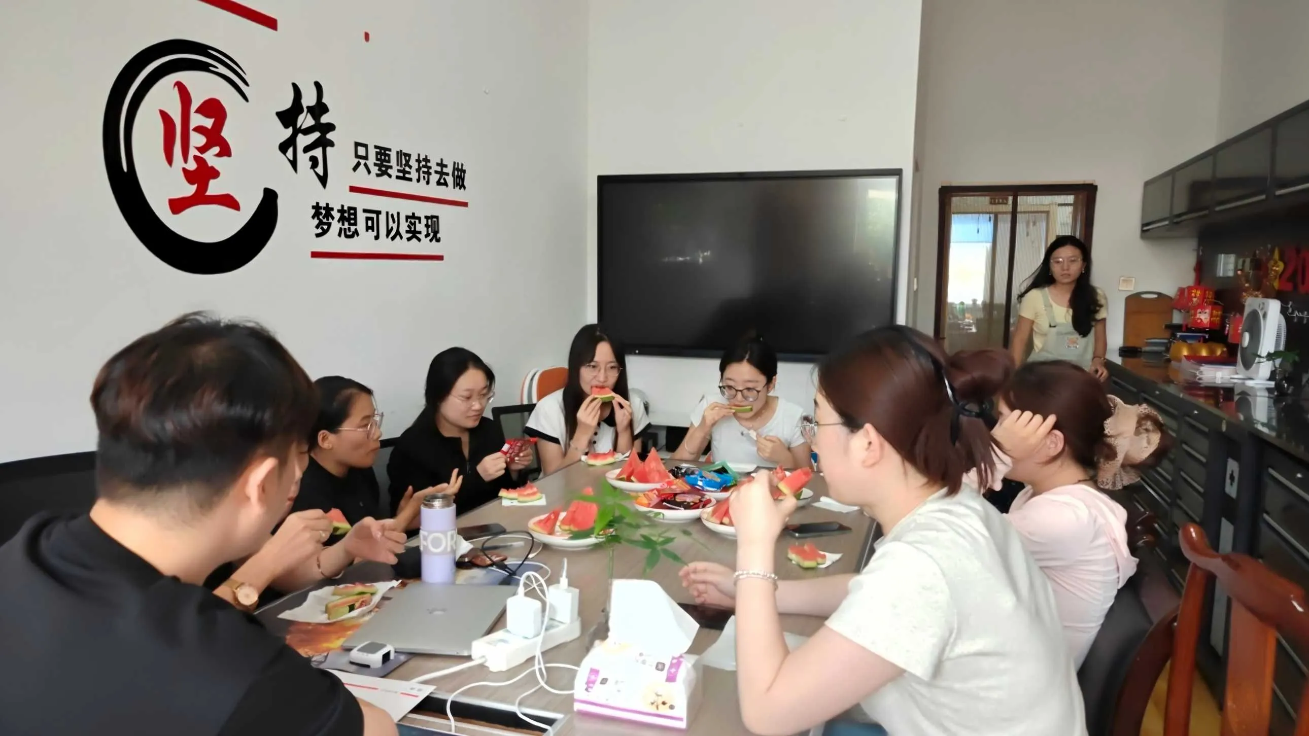 På evenemangssidan visades en mängd mellanmål snyggt, allt från krispiga nötter, söta torkade frukter till olika utsökta bakverk. De rika och olika snacks uppfyllde alla olika smakpreferenser för alla. Och det mest iögonfallande föremålet var den nyuttagna stora vattenmelonen från kylen. Den gröna huden på vattenmelon lindades runt det ljusröda köttet, och när det klipptes öppet, spilldes juicen ut och en söt arom wafted mot dem. Det blev det mest populära "kylverktyget" på den varma sommaren. De anställda satt i grupper, höll vattenmelonen i händerna och smakade på snacks, och de avslappnade chattrösterna och en glad skratt ökade och föll ständigt. Hela kontorsområdet fylldes med en atmosfär av glädje.