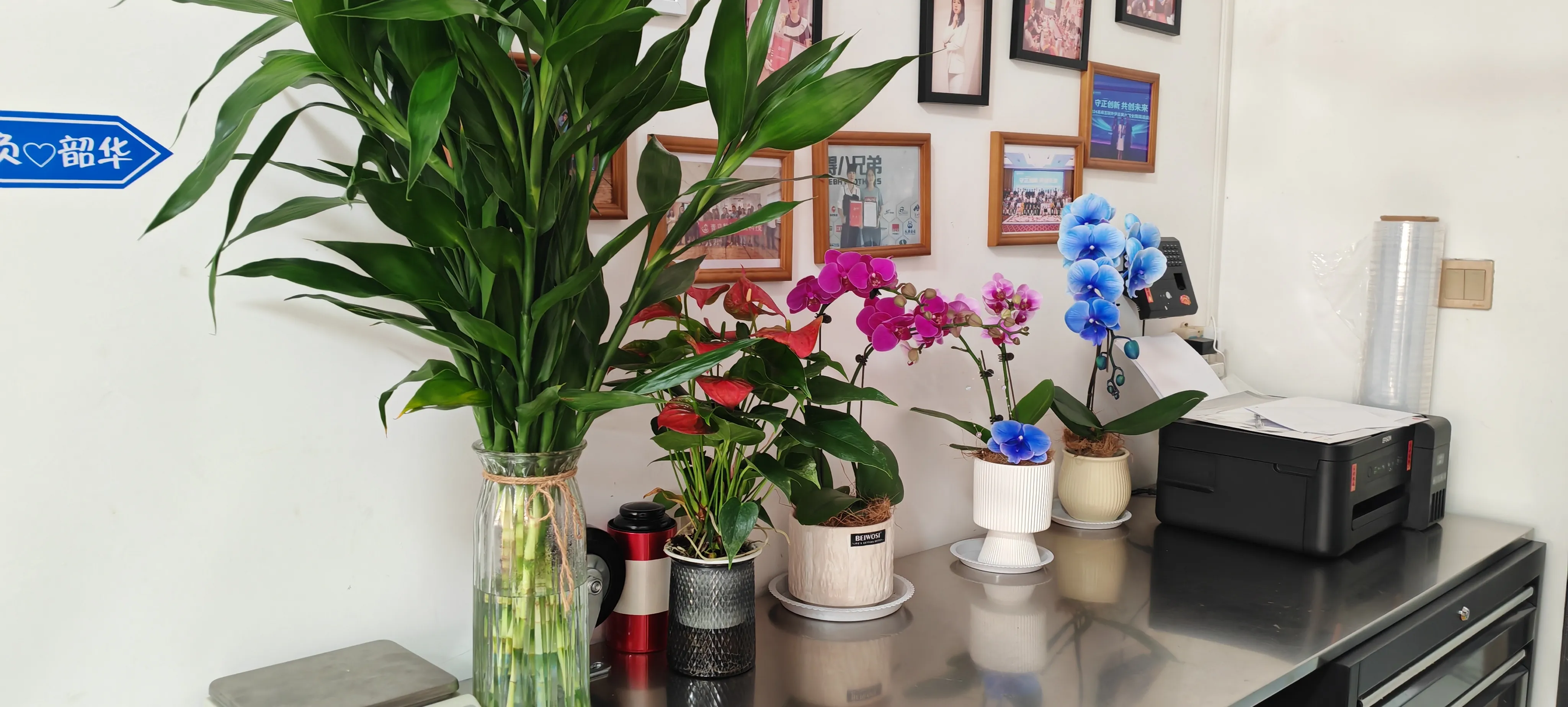Gå inJOJO Pack'skontor. Det finns tre krukor med phalaenopsis på båda sidor om receptionen. Deras blad är utspridda och raka, precis som fjärilar som ska flyga iväg. De tillför en touch av elegans och grace till företaget. Den gröna dracaena sanderiana driver bort tråkigheten i kontorslokalen. Många anställda lockas av förändringarna här så fort de kommer till företaget. De stannar för att njuta och fota med sina mobiltelefoner.