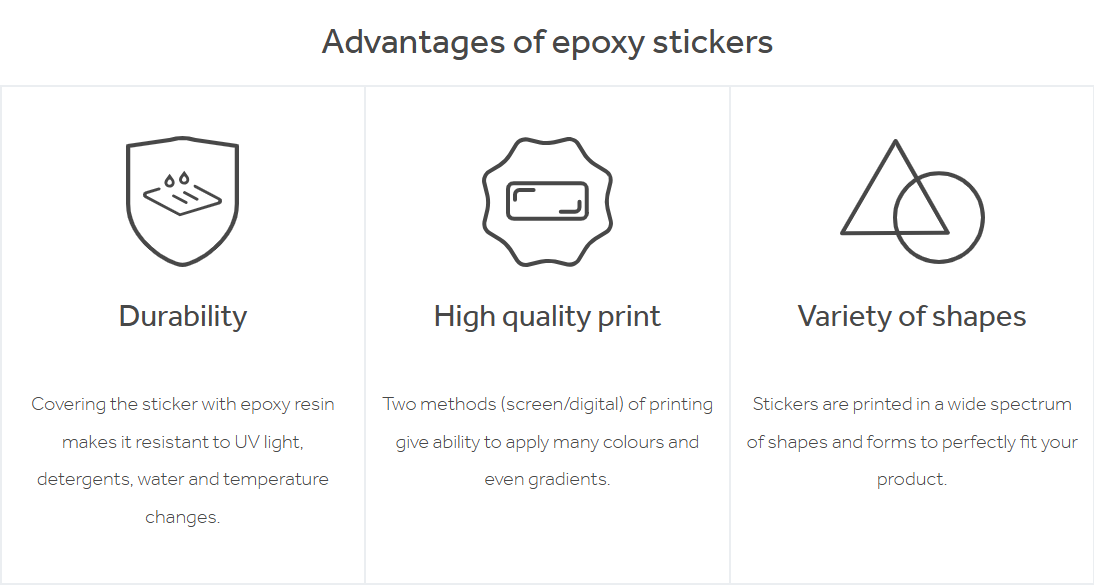 Epoxiklistermärken (även känd som3D-klistermärkes eller kupolformade klistermärken) är klistermärken med fullfärgstryck täckta med vattenbeständig, klar epoxiharts. Användning av digitaltryck eller screentryckstekniker resulterar i hög upplösning och detaljerad design.