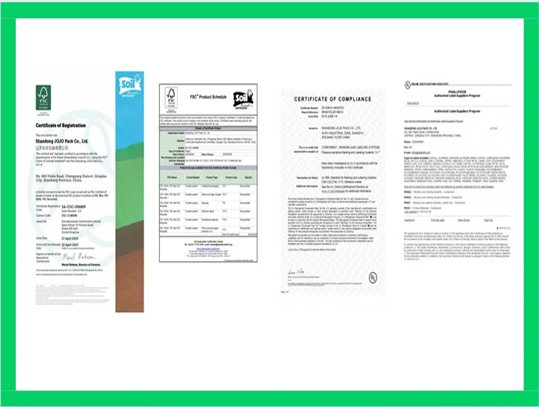 Jojo Pack-produkter har erhållit FSC och UL-certifiering, och etikettproduktionsstandarderna helt i linje med internationella standarder. Vi har ett professionellt team efter försäljning som är ansvarig för produkttransport, efter försäljningstjänster och kundåterkoppling, JoJo Pack hoppas att vinna ditt förtroende med högkvalitativa produkter och tjänster, hjälpa dina produkter mer konkurrenskraftiga och uppnå win-win-samarbete.