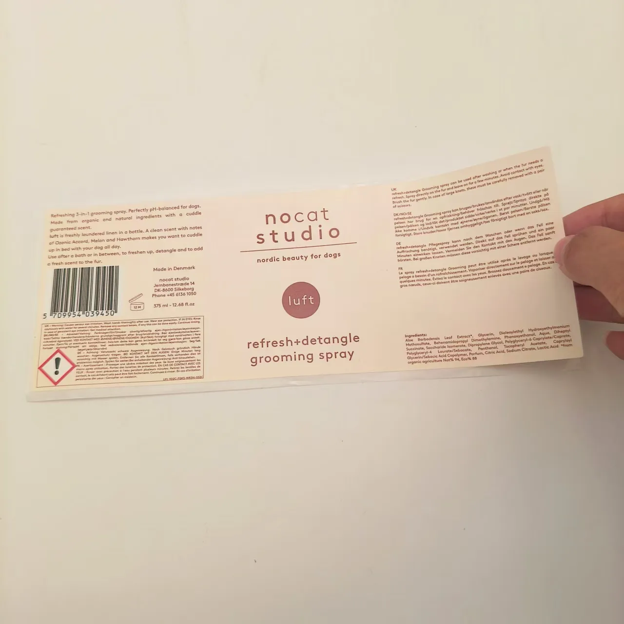 Jojopack Company har speciellt designat en avancerad etikettlösning för husdjursbalagare. Våra sprayflasketiketter är tillverkade av vattentätt och tårbeständigt material, och produktetiketten kan upprätthålla ljus och varaktig färg även i en fuktig miljö. Etiketten innehåller information som produktnamn, ingredienser, säkerhetsinstruktioner, funktioner och försiktighetsåtgärder och är ordnade på ett ordnat sätt, vilket hjälper varumärket att förbättra sin visuella konkurrenskraft.